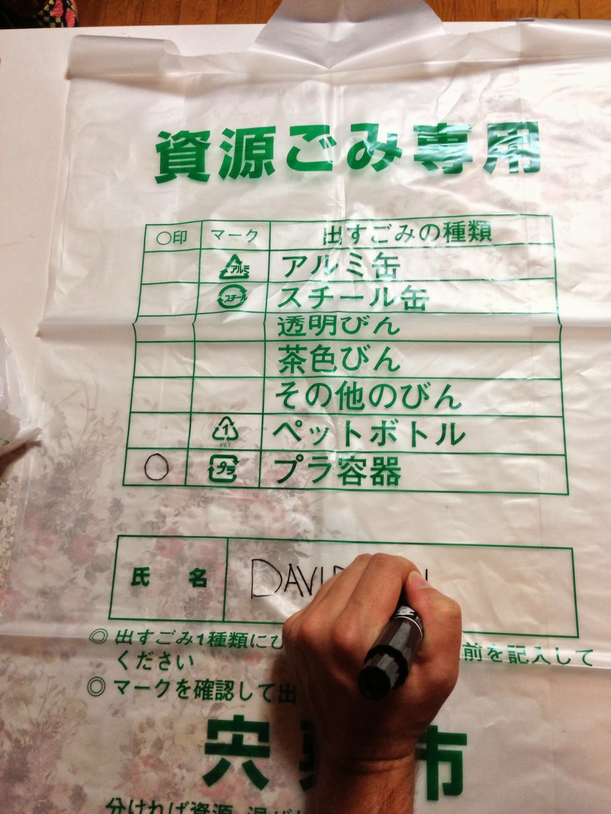 Now let’s look at what trash actually goes in. The trash system uses its own set of bags. You can buy them at most supermarkets, convenience stores, and home improvement stores, at about ¥300 for 20 bags. Yellow bags are for burnable trash, while the clear bags are for recycling of various kinds. There is a table printed on the clear bags that lists the different types of recycling. On these bags, you have to mark with a circle what type of recycling is going in that particular bag. There are also blue bags, which are for large items that don’t fit into the standard bags, as well as stickers and paper bags for paper recycling, but I haven’t seen any of these in any store I’ve been to so far. Before you start filling it with trash, you write your name on the bag. From what I understand, putting your name on the bag allows the trash men to notify you when you’ve done something wrong, e.g. you put a plastic bottle in your yellow trash bag. Privacy advocates would probably cry foul on this, as it clearly labels what was once in your possession, including documents that may contain sensitive information. I think as long as you follow standard safe practices for such things, like shredding, it is no different than America, where your trash is linked to you because it sits out in front of your house.