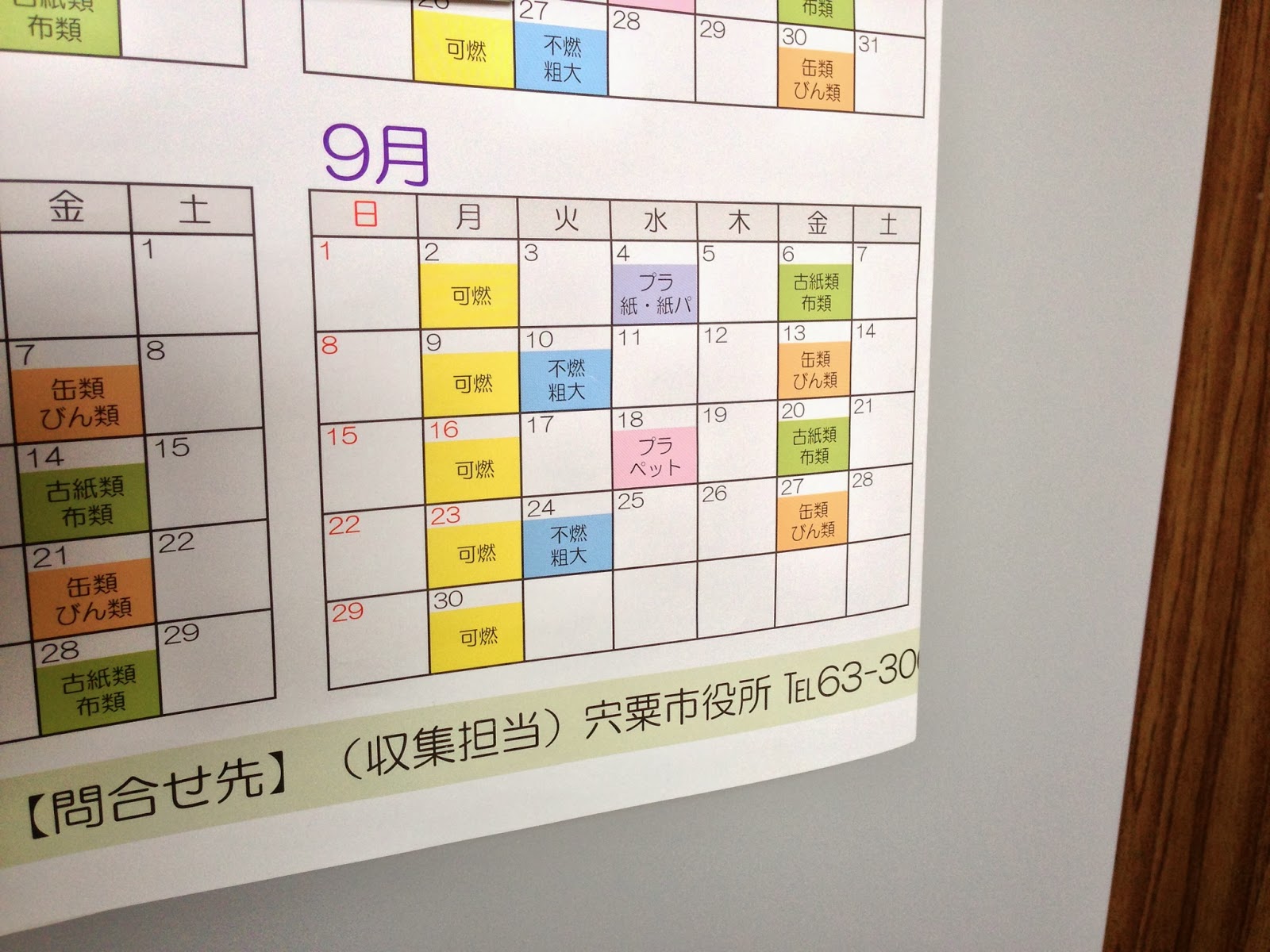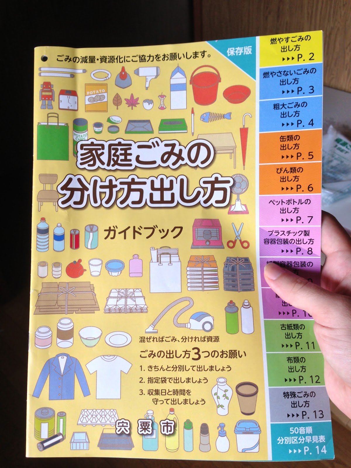 Pretend you are me for a moment. Having just arrived in Japan, there is so much you need to learn. Things you don’t consciously think about until they become a physical problem, taking up space on your kitchen counter, piling up on your dining table. You went to the store to buy some important items, like a bed, some utensils, and food, but of course you forgot the all-important, often forgotten receptacle, a trash can. “Wait!” you think. “Perhaps there is a dumpster somewhere around my apartment complex. I can just go straight there and skip the middleman!” So you look around. Nothing in the backyard, and nothing around the side. Confused, you decide to ask the teacher who lives in the apartment next to yours. He’s an English teacher, surely he’ll be able to tell you where things are. So you ring the door bell…and his wife answers. 「こんにちわ!」, she says. You ask for her husband by name, and she replies in Japanese and shakes her head. You assume she said something like, “he’s not here right now.” Figuring it shouldn’t be too hard to ask “where do you put trash?” using gestures, you make silly, exaggerated motions with the empty bag of potato chips in your hand, along with one of the question words in Japanese that you know, どこ. She doesn’t understand, so you keep repeating the same motion over and over, until you extract the Japanese word for trash (ごみ) out of her. She catches on, then blurts out a string of sentences that make absolutely no sense. After she shows you her trash bins, and you try to tell her you don’t have any, she resolves to interrupt her husband’s baseball practice to have him come explain it to you.