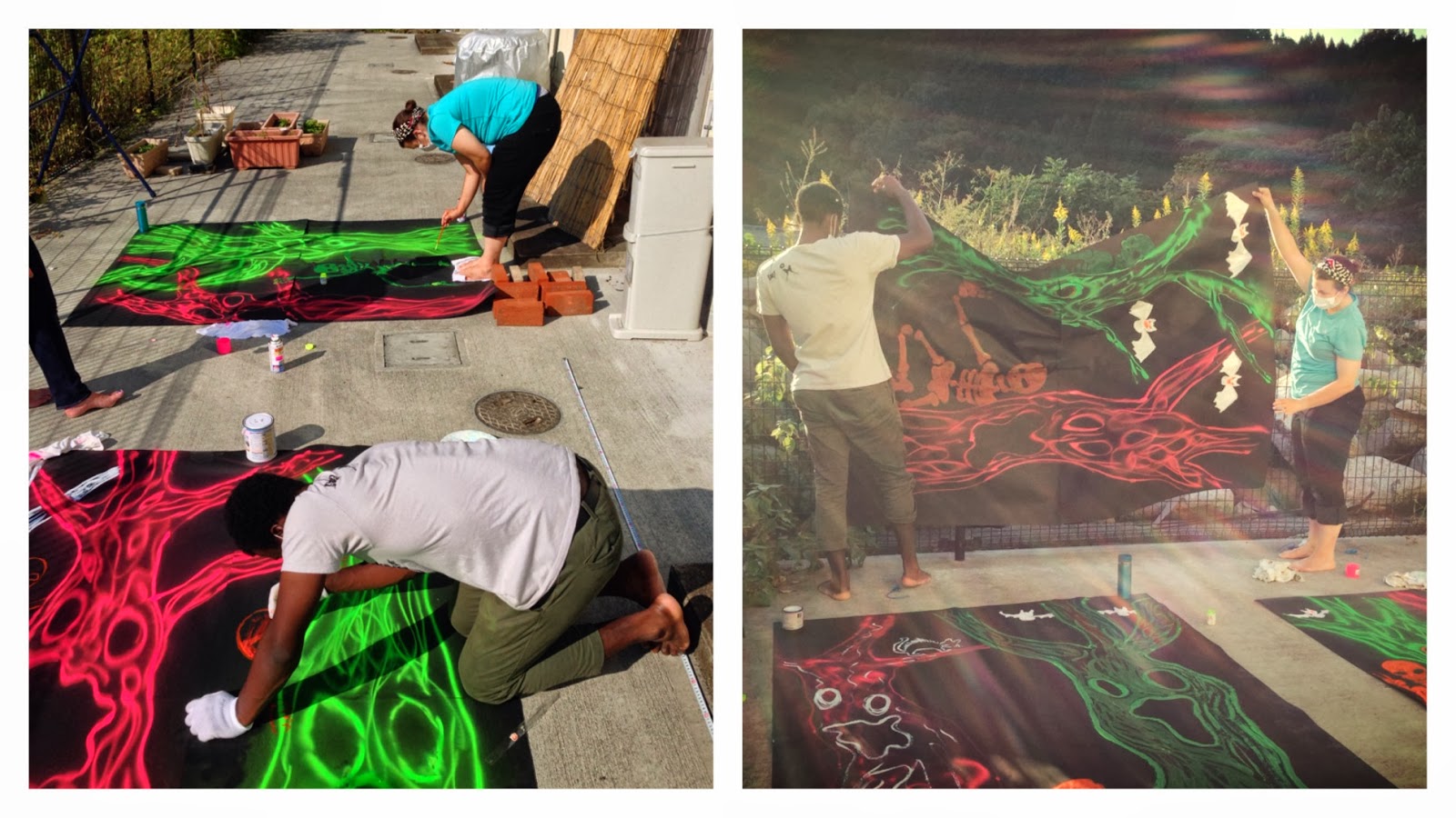 As an international festival, many different nationalities were represented in the people that attended, and a host of them set up booths where they shared a prized dish from their local cuisine. Also, since we’re currently approaching Halloween at the end of the month, the festival was an opportunity for everyone to wear a costume and teach the children about trick-or-treating. A few of us ALTs decided to extend this Halloween theme and set up the festival’s first-ever haunted house in the adjoining parking lot. Underneath 3 tents, there was an outdoor face-painting and games section, a murder room with a bloody table and creepy pictures on the wall, and a blacklight room rendered dark with rolls of black, trashbag-like plastic.