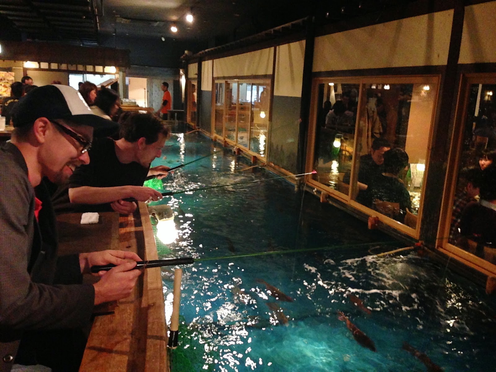 That night, we went to ざうお, a seafood restaurant recommended in the Lonely Planet guide to Osaka for its unusual style of dining. The main room has a dining area shaped like the bow of a large wooden boat, where you sit in the traditional Japanese style at tables that are situated port and starboard. Along the sides are giant fish tanks filled with a variety of specimens…I think you can see where I’m going with this. It’s a restaurant where you literally fish for your dinner. A very cool premise, but much more frustrating in practice. Despite our valiant attempts, only one of us actually managed to hook something—probably because of our continued consumption of adult beverages. #sakelifestyle