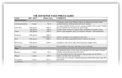 In perhaps the surest sign of madness since I’ve started preparations for a monthly budget, I have been doing a fairly extensive analysis on food prices in the soko (market) in town. Shown below is a sample of the table I created with the data I collected this past Thursday, just before I bought my new oven (quite a successful day, I admit).
