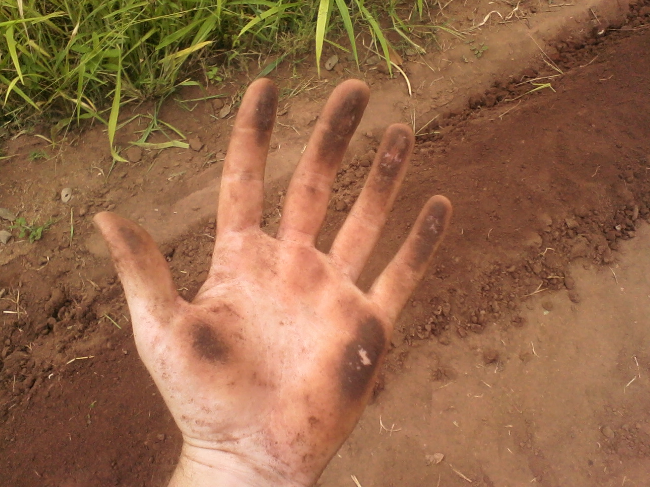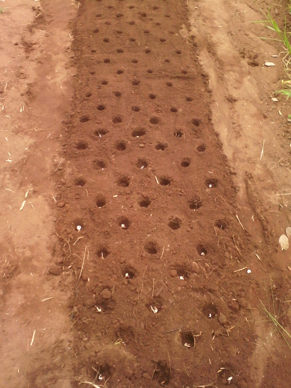 By the time I woke up the next morning, the beans were already beginning to sprout, so things were looking good. I had to work that day (Monday) unfortunately, and came home wiped out and feeling sick, so nothing happened Monday besides keeping the beans wet. Tuesday, while staying home from work because of a head cold, I felt well enough in the afternoon to go out and plant the beans. Harnessing all of my permagarden training, I dug two beds on opposite ends of the space I cleared and planted them in the signature hexagonal pattern (I’d just call it isometric, personally). I’m not really sure if I had to go through this much trouble just to plant beans; usually when we do these Peace Corps permagarden trainings we plant big stuff like corn. In any case, it was good practice for when I start planting the centerpieces in my garden, whatever they may be (suggestions welcome,preferably something that I can harvest before November).