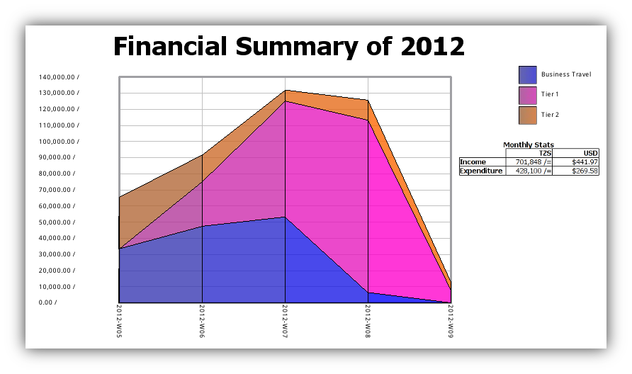 As for the legend, I’ve split my costs into simple categories organized in tiers. Tier 1 includes all necessities, such as groceries, transport to the market, toiletries and household items, etc. Tier 2 is a catch-all for just about everything else, like nice meals out on the town, entertainment expenses (watching the Super Bowl, for example), and anything I’ve deemed not necessary for surviving in Tanzania. Business Travel is self-explanatory; all expenses incurred while on the road for my job. This is also the main reason why I’ve spent so much more than I normally do in a month. I usually only spend about half this amount.